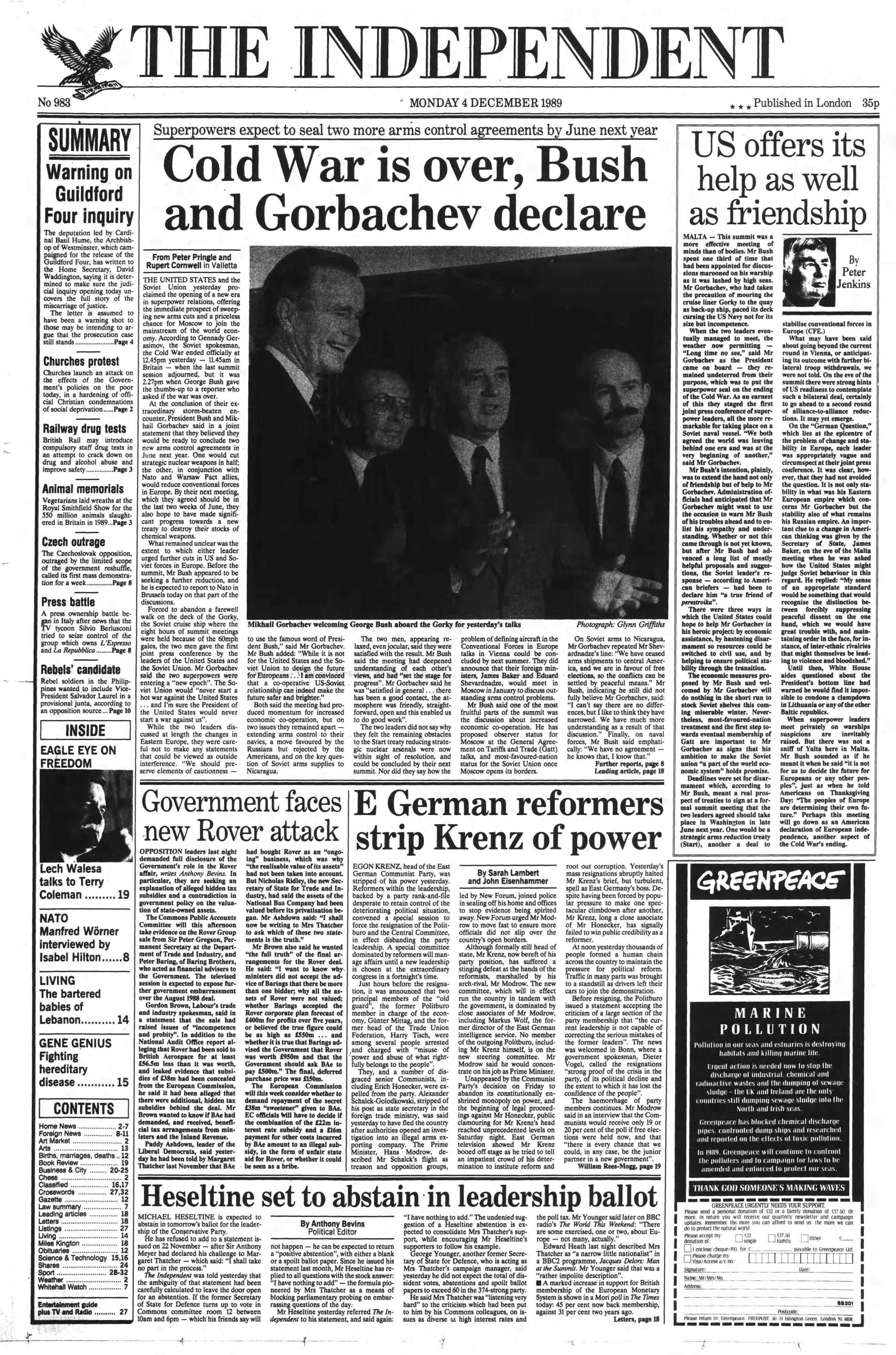 In a joint statement following their summit in Malta, US president George HW Bush and Soviet leader Mikhail Gorbachev announce that the Cold War is effectively over. Coming less than a month after the fall of the Berlin Wall, the declaration marks a decisive break with decades of nuclear brinkmanship and ideological rivalry.