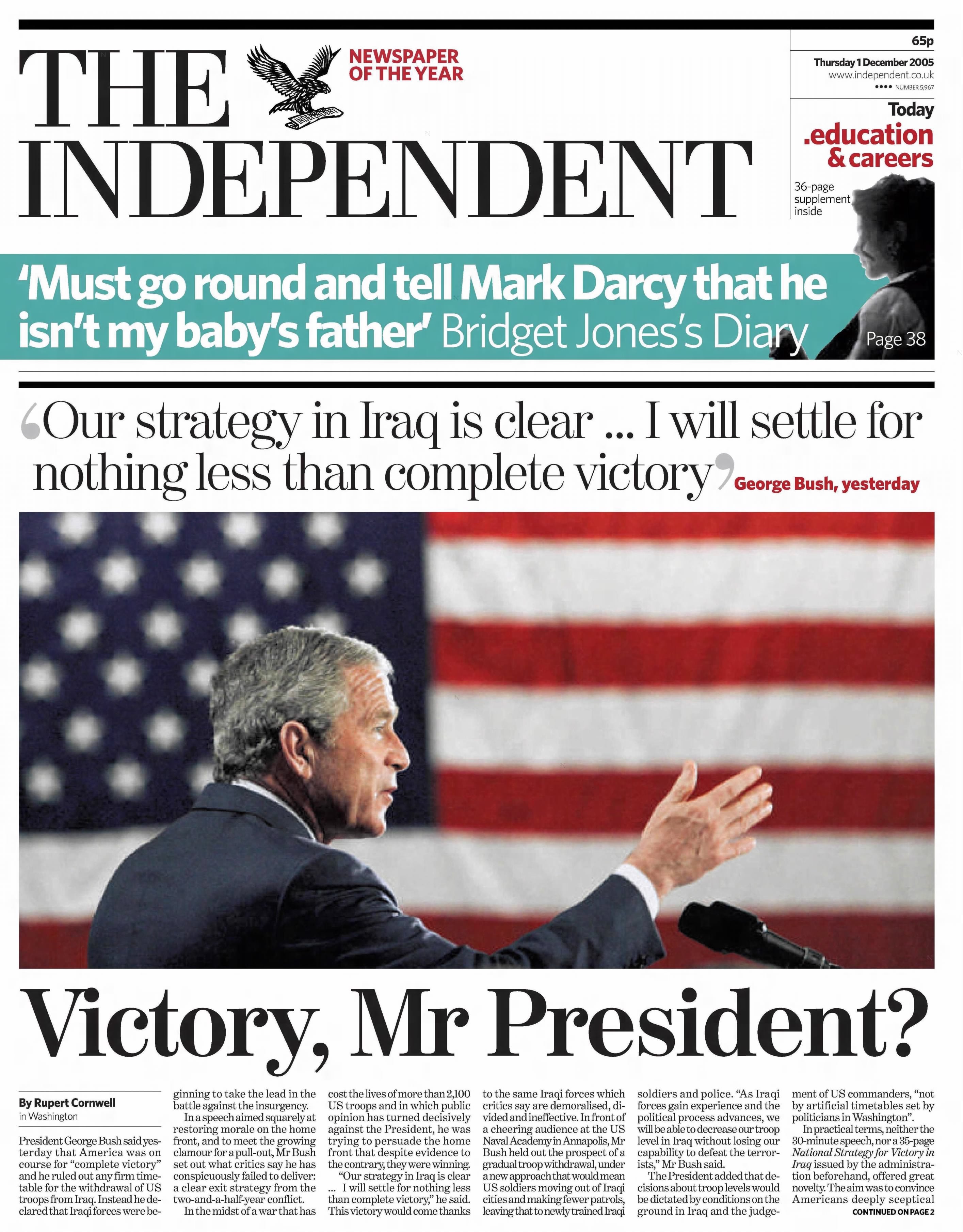 President George W. Bush delivers a major address defending his administration’s approach to the Iraq war and insisting that “nothing less than victory” is acceptable. His speech comes amid mounting US casualties, growing public scepticism and increasing debate over the future of American involvement.