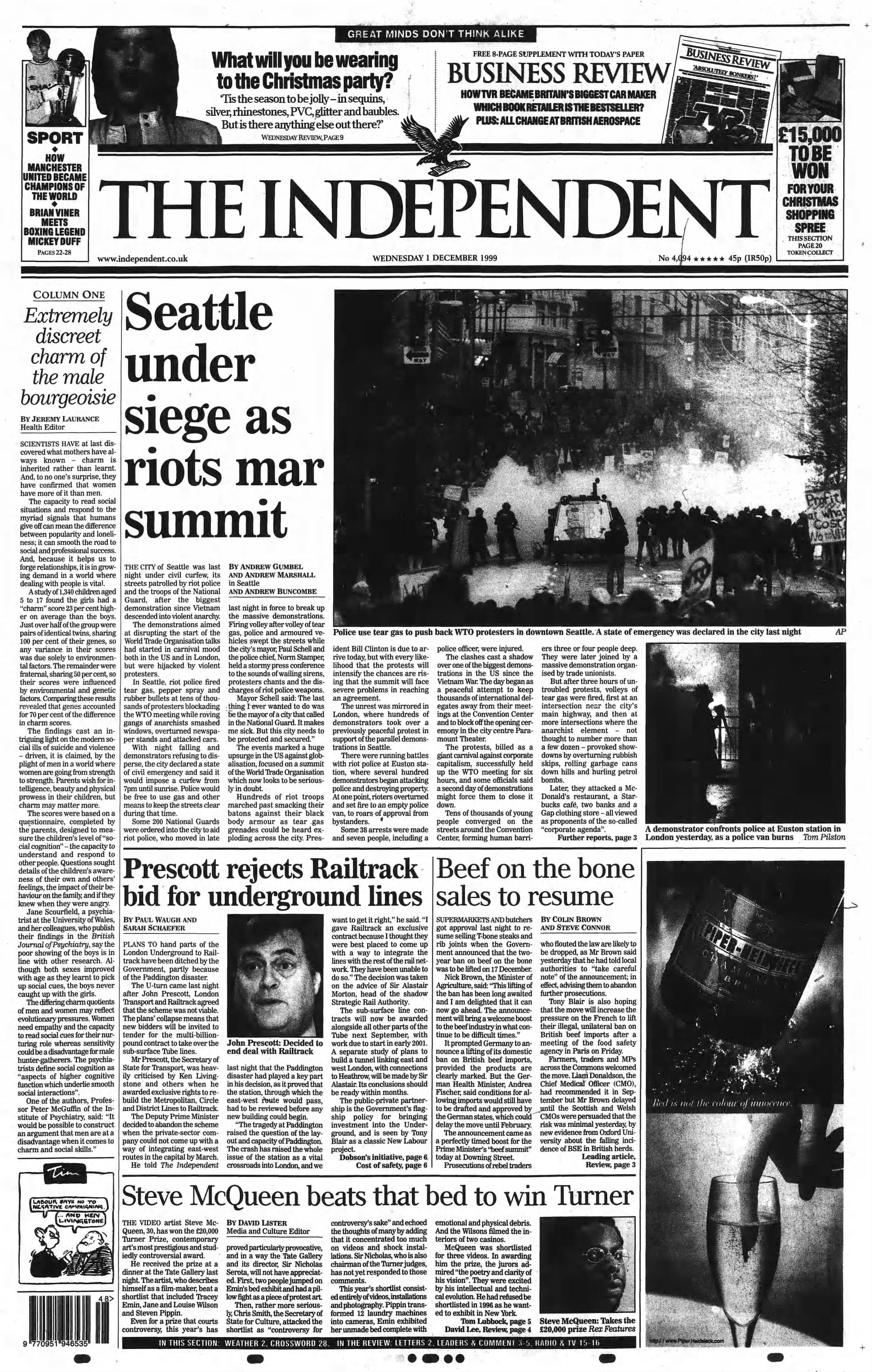 From Malta comes a message that the Cold War is finally over. Across the Atlantic, headlines tell a story of unrest, from siege in Seattle to tensions over the Iraq War. In the courtroom, OJ Simpson is jailed over an armed robbery in Las Vegas, while Amanda Knox is convicted of the murder of Meredith Kercher. Across decades, 1–7 December charts turning points in politics, culture and public life – captured on The Independent’s front pages as history unfolded.