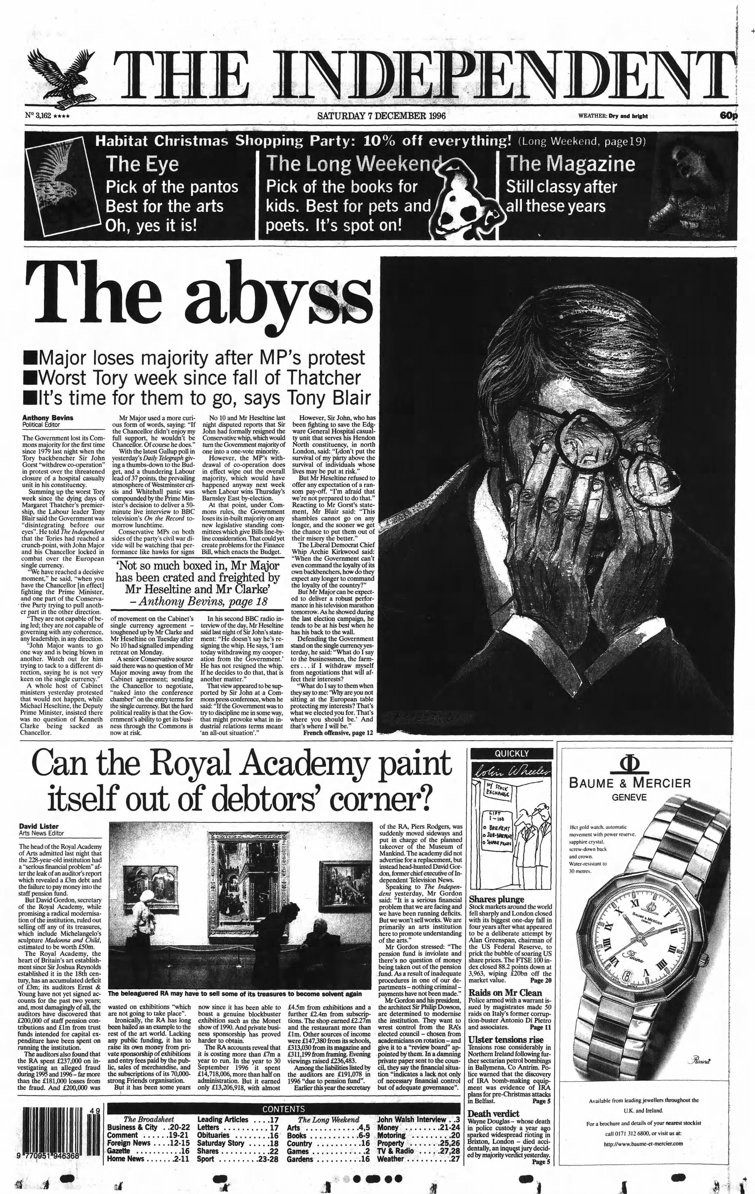 John Major faces a fresh political blow as a Conservative MP resigns the whip in protest, stripping the government of its majority in Parliament. The Independent frames the moment as a deepening crisis for a prime minister already struggling with internal party divisions.