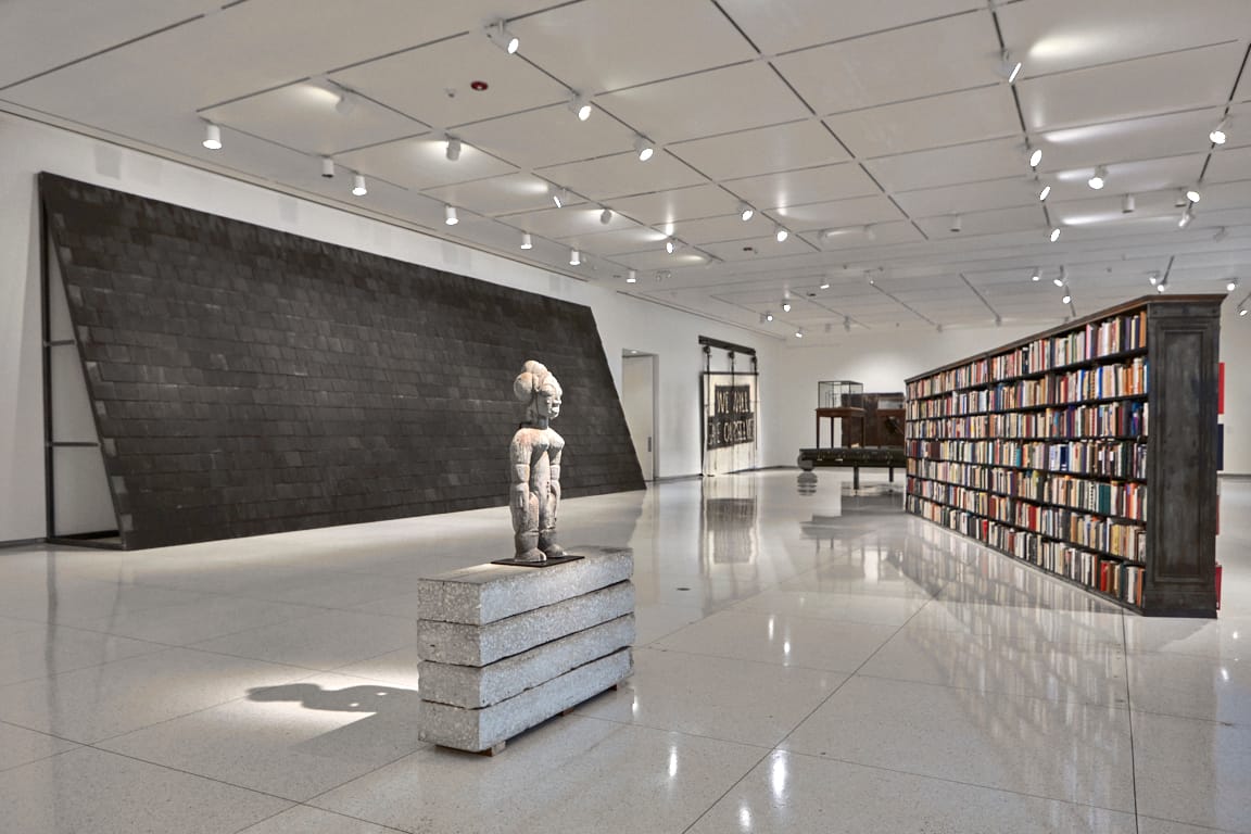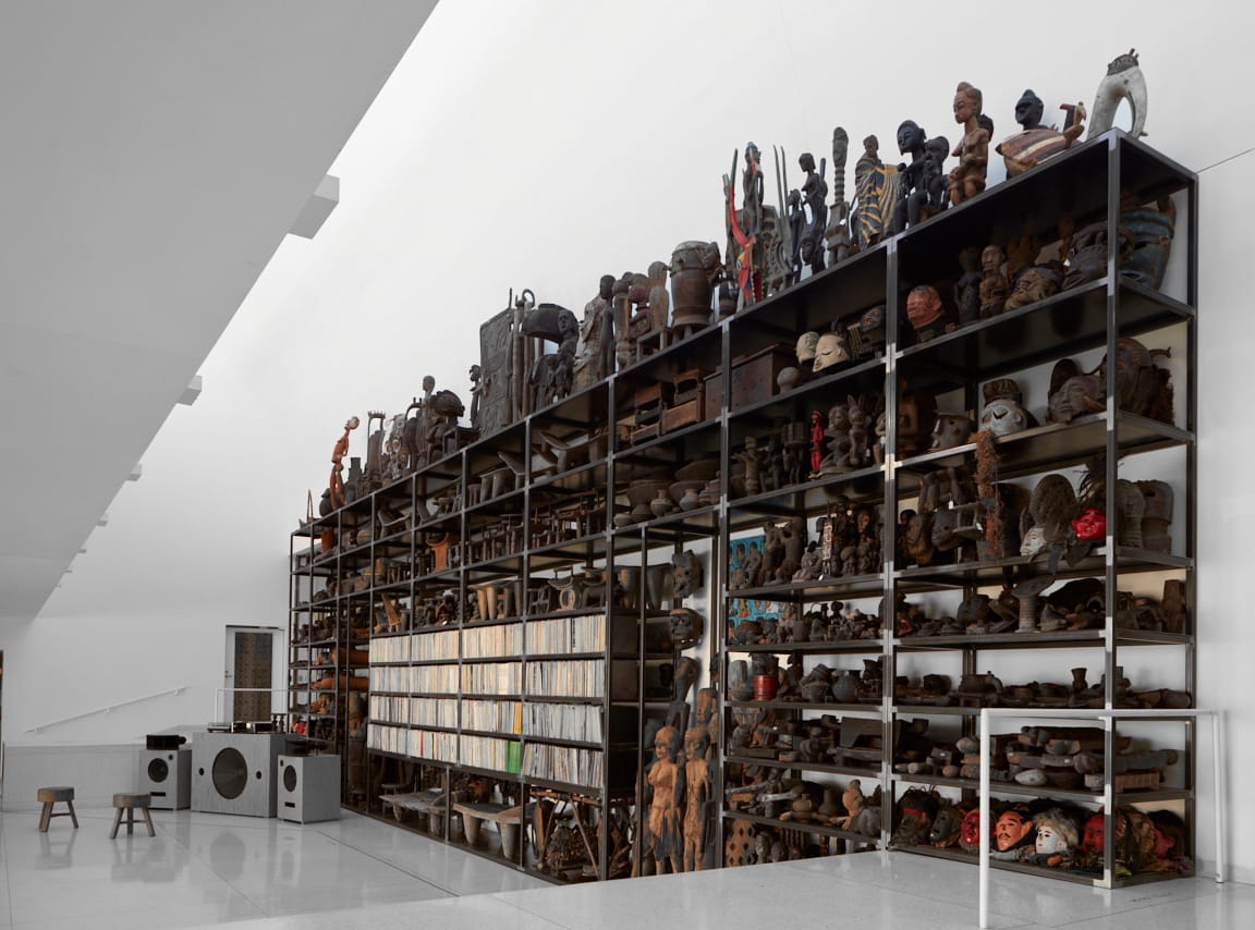 Installation view of Theaster Gates, African Still Life #3: A Tribute to Patric McCoy and Marva Jolly (2025), African reliquary, vinyl records, steel shelving, sound system designed by OJAS, record player (courtesy Smart Museum of Art)My second takeaway is that Gates can aestheticize anything — something he shares with Marcel Duchamp — and he is brilliant at it. And yet, there were times I felt dissatisfied as I looked at the two exhibitions at the Smart Museum, his first institutional show in the city where he was born, raised, and has had the greatest social impact.