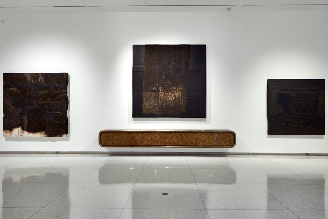 Installation view of Theaster Gates: Unto Thee at the Smart Museum of Art. Left to right: "Painting for My Father" (2023), "Roof Portrait" (2024), and "Defend the Black Community" (2025) (courtesy Smart Museum of Art)Gates pushes the conundrum further in Unto Thee, which takes up the museum’s largest gallery, and includes paintings and ceramics by the artist placed among different objects he has been given by individuals and institutions (among the latter items are a credenza, a large section of a slate roof, and a friend and colleague’s book collection).